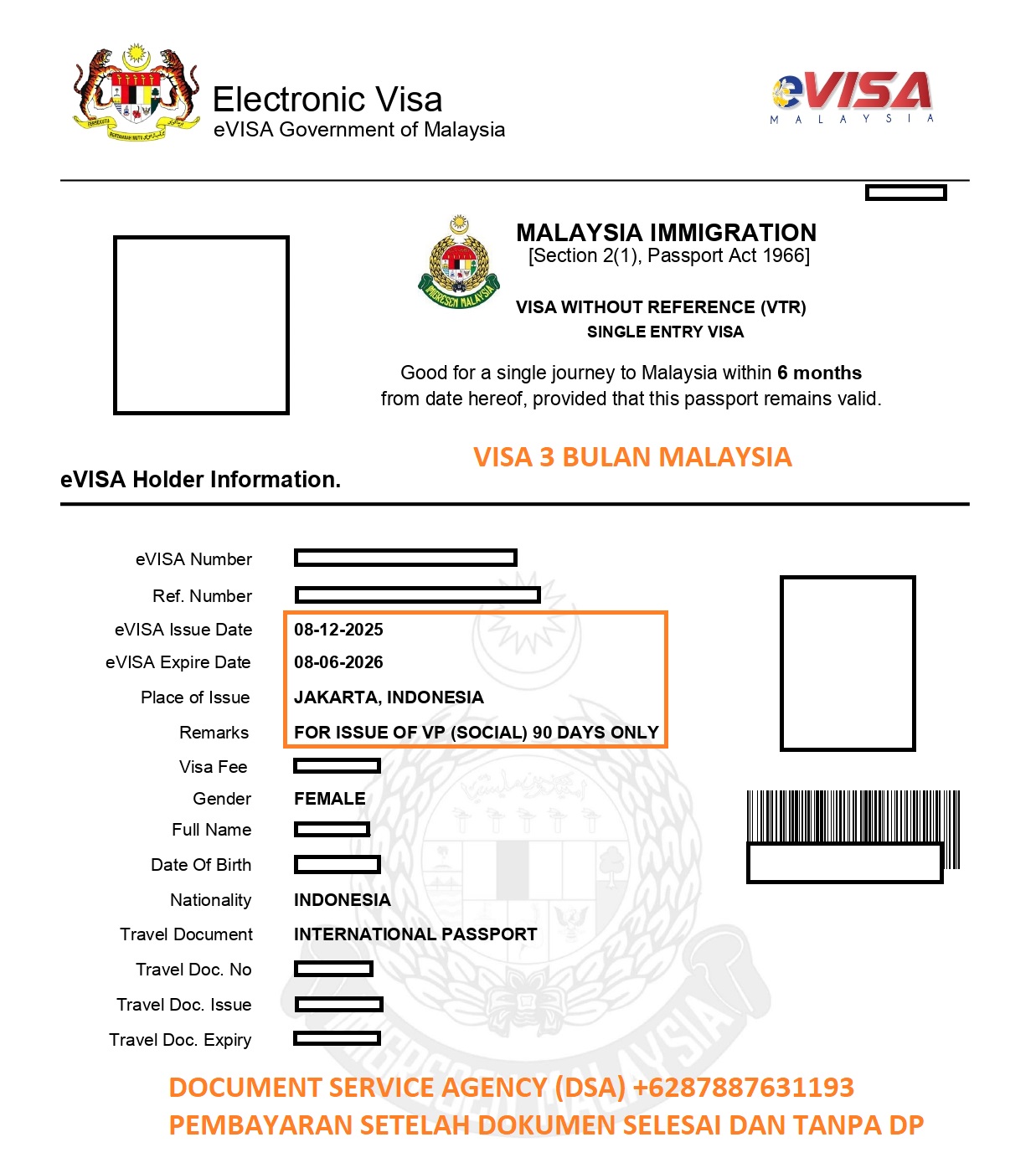 DSA (Document Service Agency) adalah spesialis jasa terjemah, legalisir, atestasi, apostile dokumen untuk keperluan di luar negeri dan pengurusan visa berpengalaman dan terpercaya. Bagi anda yang ingin mngurus visa di Kedutaan Malaysia untuk keperluan liburan, bisnis, bekerja dan lain-lain. Anda tidak perlu datang ke Jakarta karna pengurusan visa anda bisa diwakilkan kepada kami, dengan layanan ” Pembayaran Setelah Dokumen Selesai dan Tanpa DP ” membuat anda lebih nyaman dan aman menggunakan jasa kami.